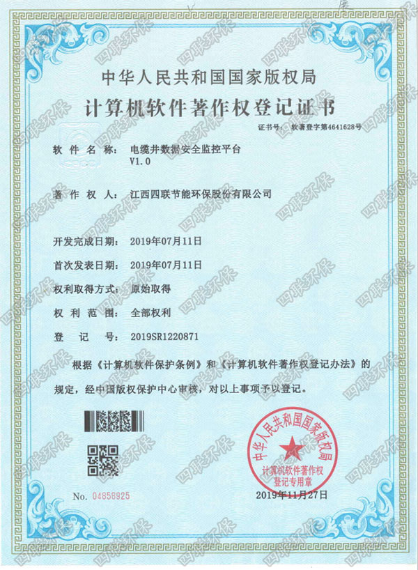 計算機軟件著(zhù)作權登記證書(shū)(電纜井數據安全監控平臺)