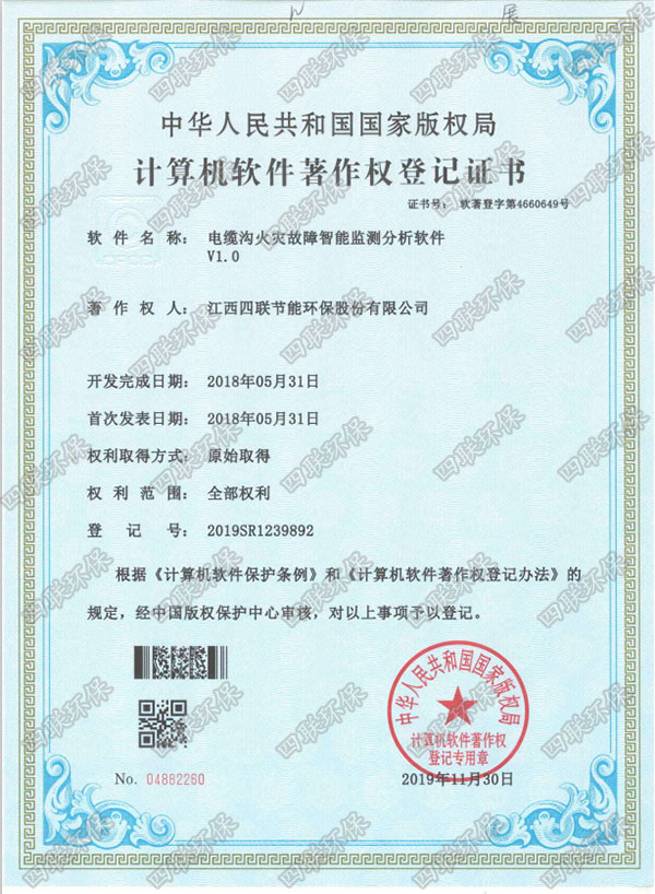 計算機軟件著(zhù)作權登記證書(shū)(電纜溝火災事故智能監測分析軟件)